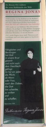 Berlin war bis zum Krieg eines der großen geistigen Zentren jüdischen Lebens in Europa. Wichtige theologische und kulturelle Impulse gingen von hier aus. Die erste Rabbinerin weltweit wurde vor dem Krieg in Berlin ordiniert. Die Theologin Regina Jonas hatte sich das Recht der Ordination im Jahr 1936 erkämpft, lange vor ihren christlichen Kolleginnen. Heute erinnert ein lebensgroßes Foto an ihrem Wohnhaus an die mutige jüdische Theologin, 1942 wurde sie ermordet.